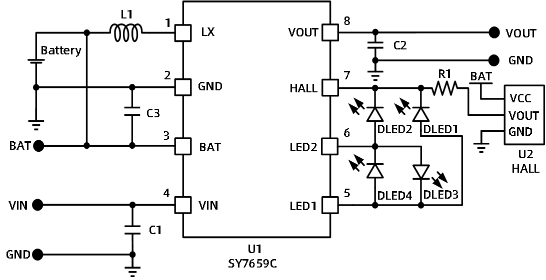 SY7659是一款专为蓝牙耳机充电仓设计的单芯片解决方案IC,芯片集成充电管理模块、LED电量显示模块、同步升压放电管理模块,简化了外围电路及器件数量。针对蓝牙耳机充电仓的应用,提供更简单易用的高性价比解决方案。
