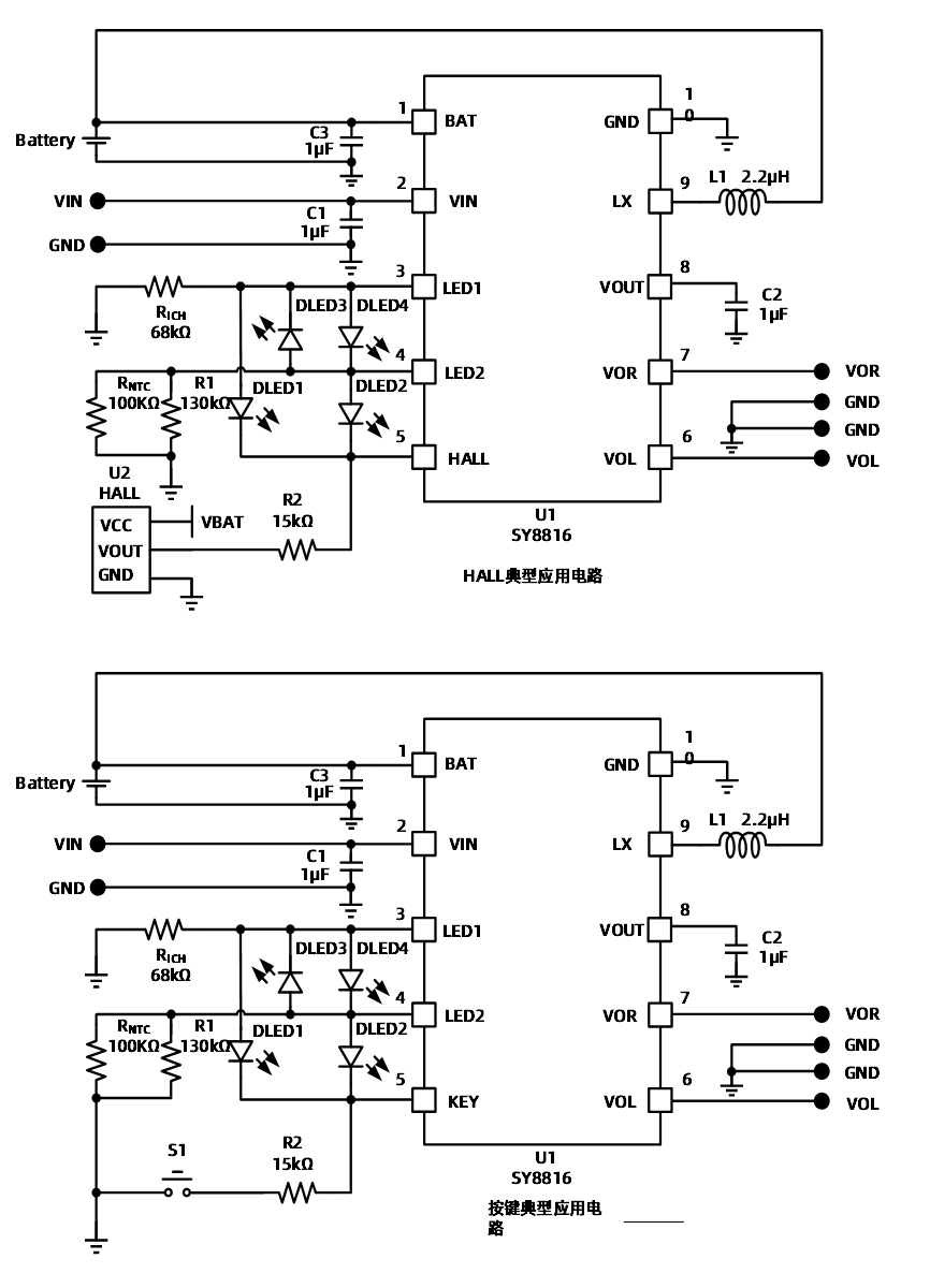 支持自动识别按键/HALL功能,当识别为按键功能时,短按开启放电,长按关闭放电,当识别为HALL时,可用HALL芯片直接驱动芯片