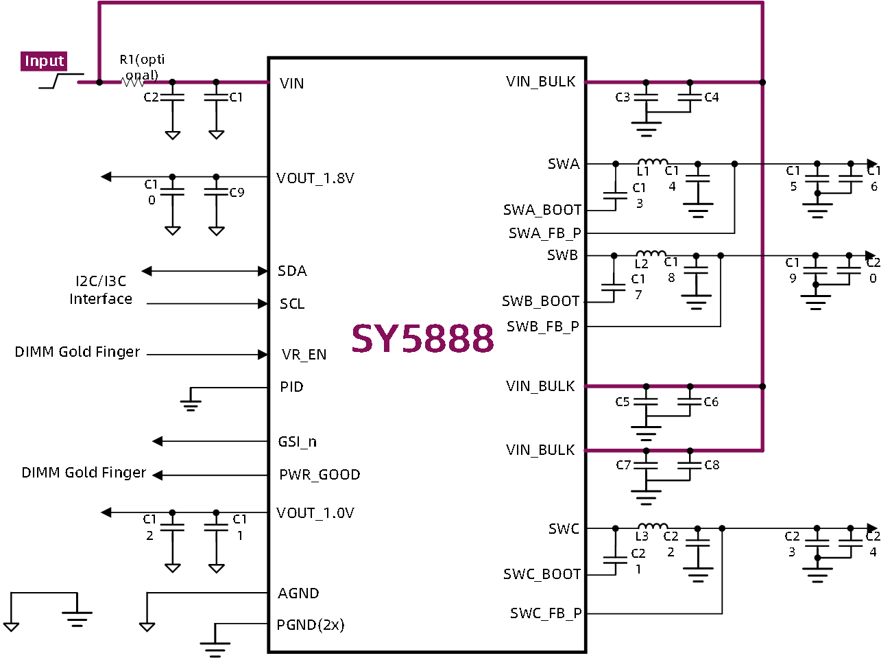VOUT_1.8V/VOUT_1.0V LDOs are intended to power supply SPD hub and Temp Sensor on DIMM. SY5888 is available FC-QFN28 3mmx4mm package, and is halogen and lead free, compliant with RoHS.