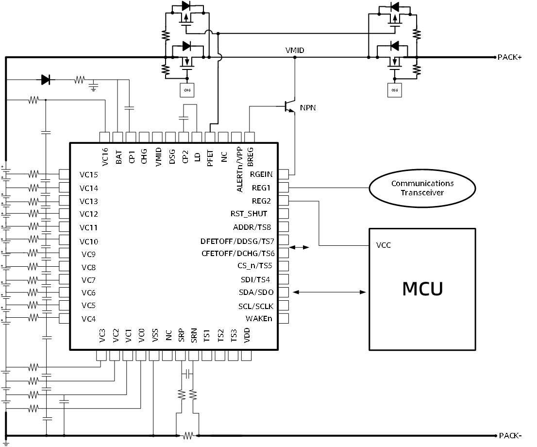 Reliable and flexible protection FET driver; Integrated dual-charge pump for high-side NFET driver; Integrated multi-purpose high-side PFET driver, support pre-charge, pre-discharge, and parallel charge path short protection; Support MCU control directly, by register, or by CFETOFF/DFETOFF pin;